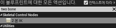 다음 애님그래프에서 2본 IK 노드를 설치한다. 이 노드는 캐릭터 사지(팔, 다리)와 같은 3조인트로 이어진 본을 IK 할 수 있게 하는 노드이다.