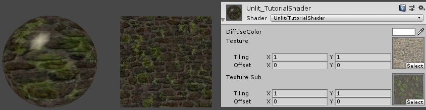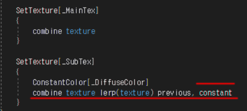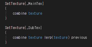 | SetTexture[_MainTex] { combine texture } SetTexture[_SubTex] { combine texture * previous } |
