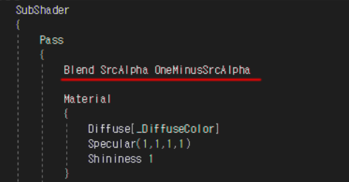 위 코드는 반투명 처리하기 위한 Blend 세팅 코드로