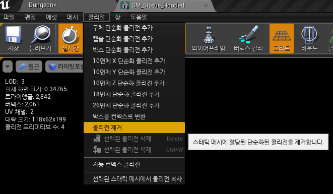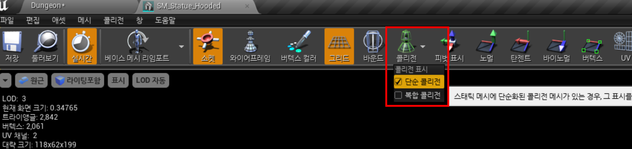 만약 배경에 설치할 이 Static Mesh가 콜리전이 섬세해야하거나, 콜리전이 필요없거나 해당 메쉬의 용도에 맞춰 최적화해야합니다.