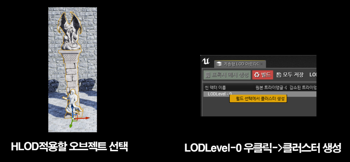 뷰포트에서 HLOD적용할 오브젝트 선택후 LODLevel-0 우클릭하고 클러스터 생성합니다.
