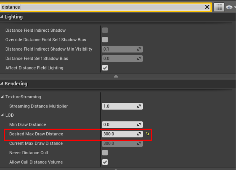 레벨에 배치된 오브젝트를 선택 후 디테일 패널을 보면 Desired Max Draw Distance가 있습니다, 입력한 숫자는 거리값이고 해당 거리값이상 멀어지면 렌더링하지 않게 됩니다.