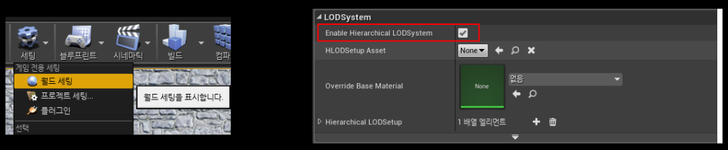 HLOD를 사용하기 위해서는 세팅->월드세팅에서 HLOD를 활성화 시켜야합니다.