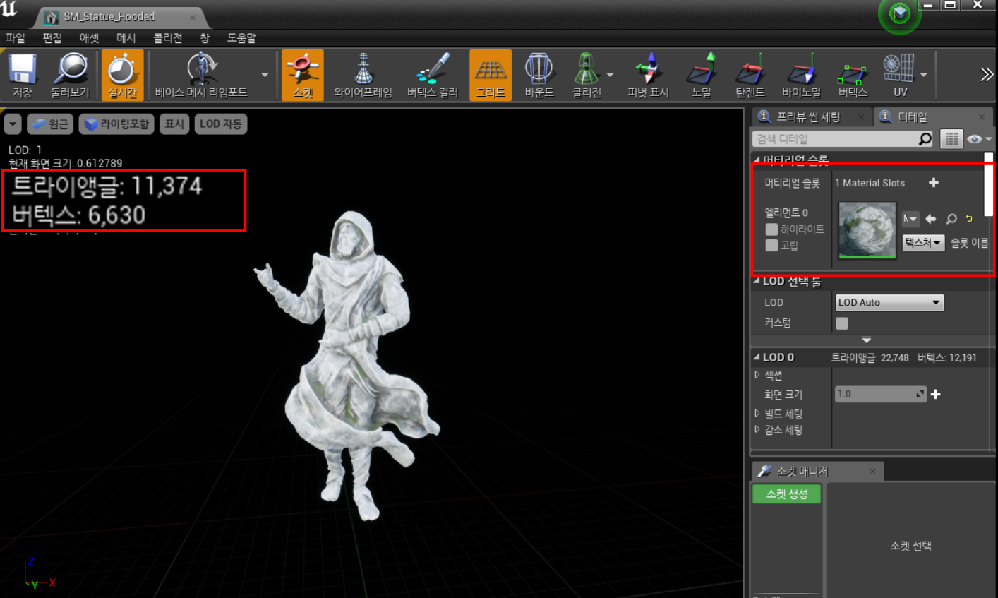 이전에 포스팅한 Skeletal Mesh게시글과 동일하게 Bone(본)정보만 없을뿐 똑같이 버텍스 수가 낮고 마테리얼 슬롯이 적어야 가벼운 오브젝트입니다.
