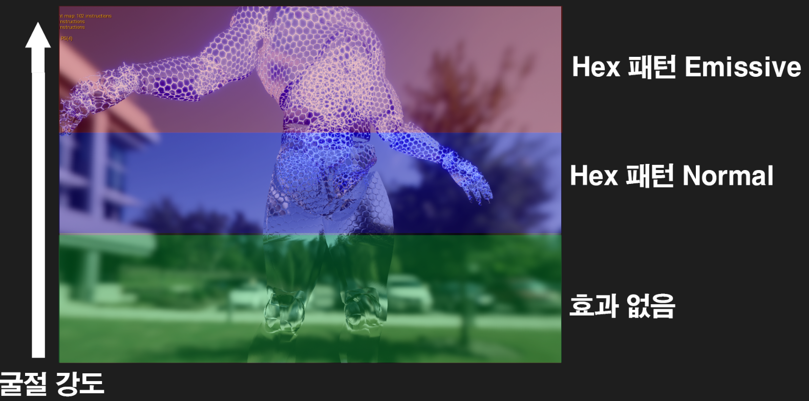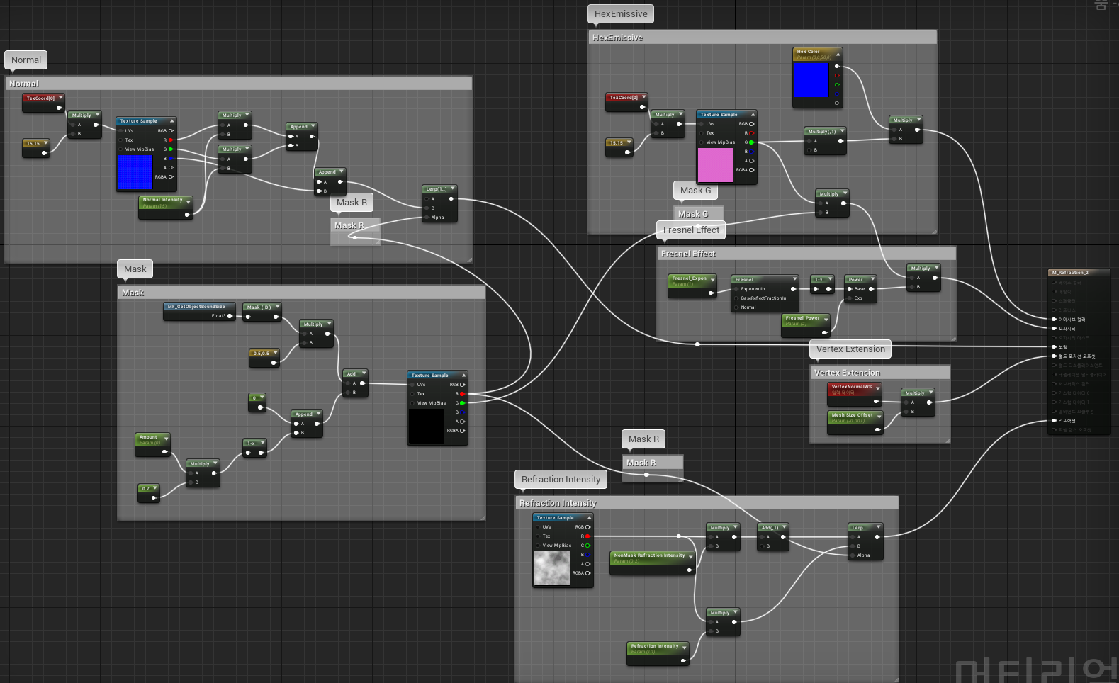 이 마스킹정보를 이용해서 Hex Emissive, Hex Normal, 굴절강도를 조절하겠습니다.