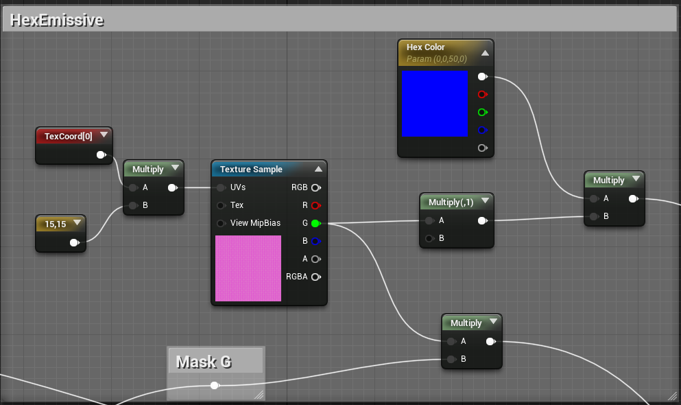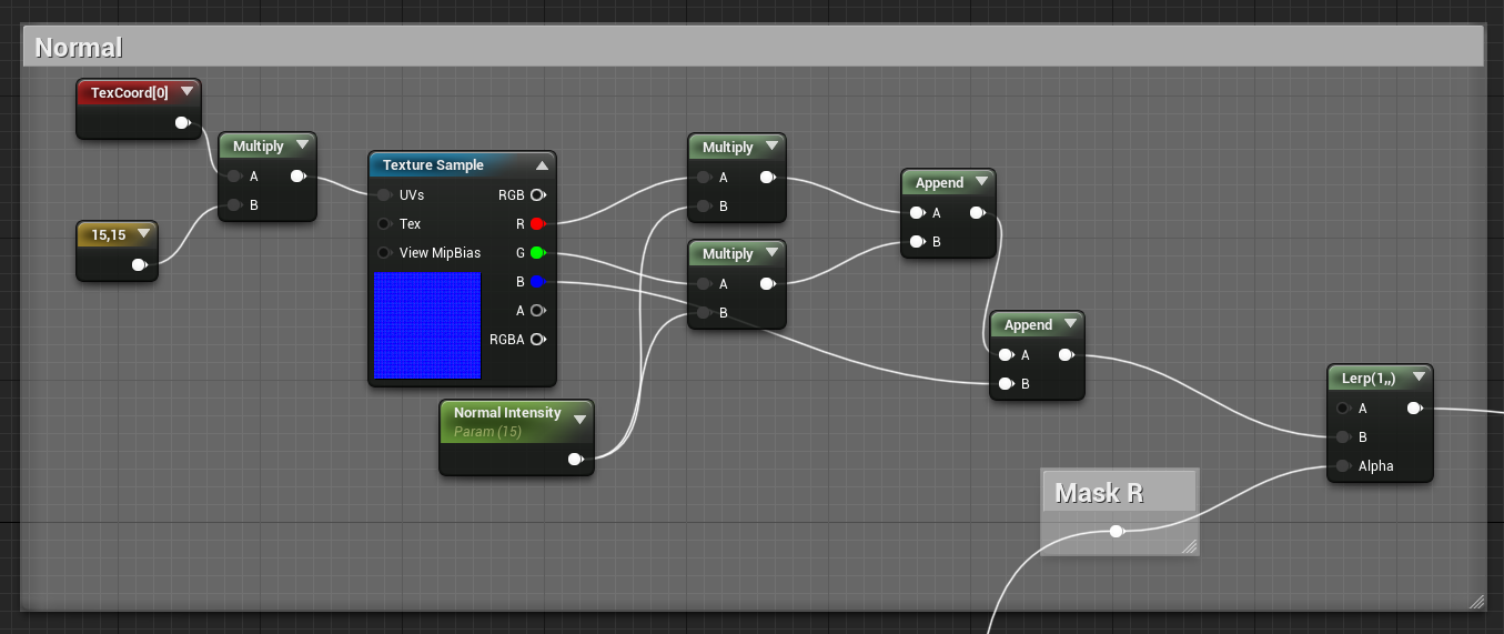 노드는 위와 같습니다, 텍스처 UV에 육각패턴을 촘촘하게 하기 위해 15x만큼 타일링을 했고 R, G채널을 뽑아서 노멀 강도를 조정 가능하게 만들었습니다,