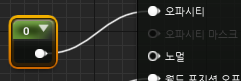 이후 이 데이터를 Lerp노드에 넣고 Alpha값은 이전 마스크 데이터의 R채널을 이용했습니다, 위 Lerp값은 노멀 핀으로 연결합니다.