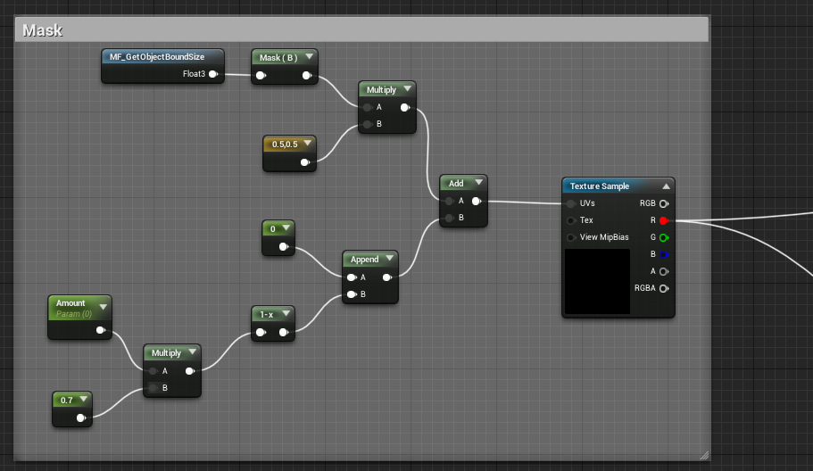 위와 같이 노드를 구현하고 우측에 Lerp의 Alpha는 이전에 만든 마스크 노드에서 R채널 값을 가져왔습니다,
