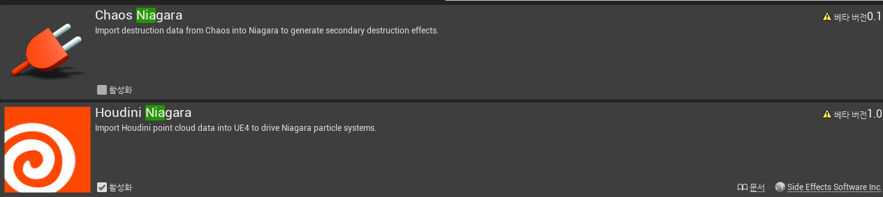 프로젝트를 생성하고 플러그인->FX에서 Niagara, Extras를 활성화하고 재시작합니다.(Houdini는 다루지 않겠습니다.)