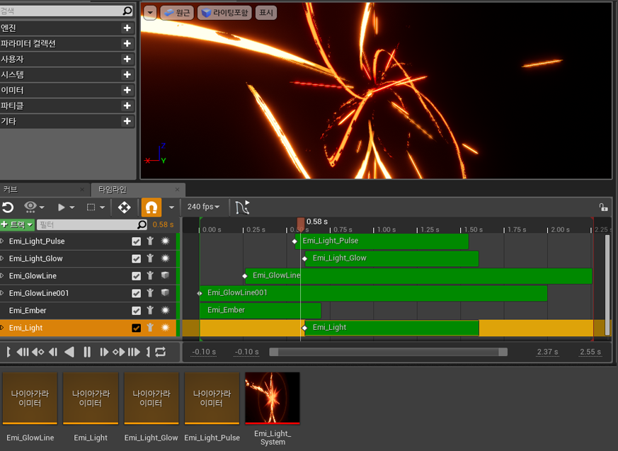위 사진은 별도의 이미터들을 나이아가라 시스템이라는 파일에서 합쳐서 하나의 이펙트를 만든 것 입니다.