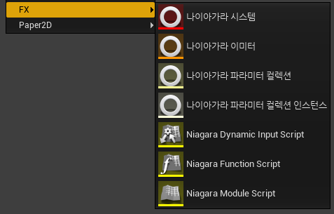 콘텐츠 브라우저 -> 신규추가 -> FX를 보시면 나이아가라가 추가된 것을 확인 할 수 있습니다.