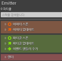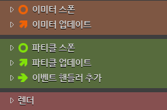 -이미터 업데이트(Emitter Update) : 매 프레임마다 해당 섹션이 실행됩니다.(이미터 제어 관련 모듈을 사용합니다)