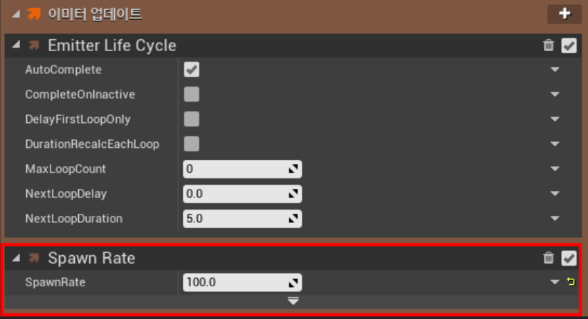 -이미터 스폰(Emitter Spawn) : 이미터가 최초 시작될때 해당 섹션이 실행됩니다.
