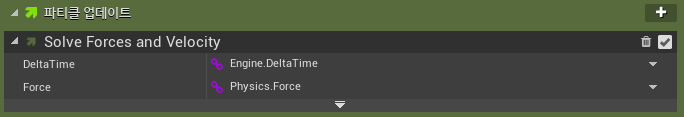 "파티클 업데이트" 섹션에서 "Solve Forces and Velocity" 모듈을 추가해야합니다.