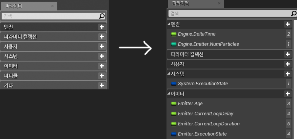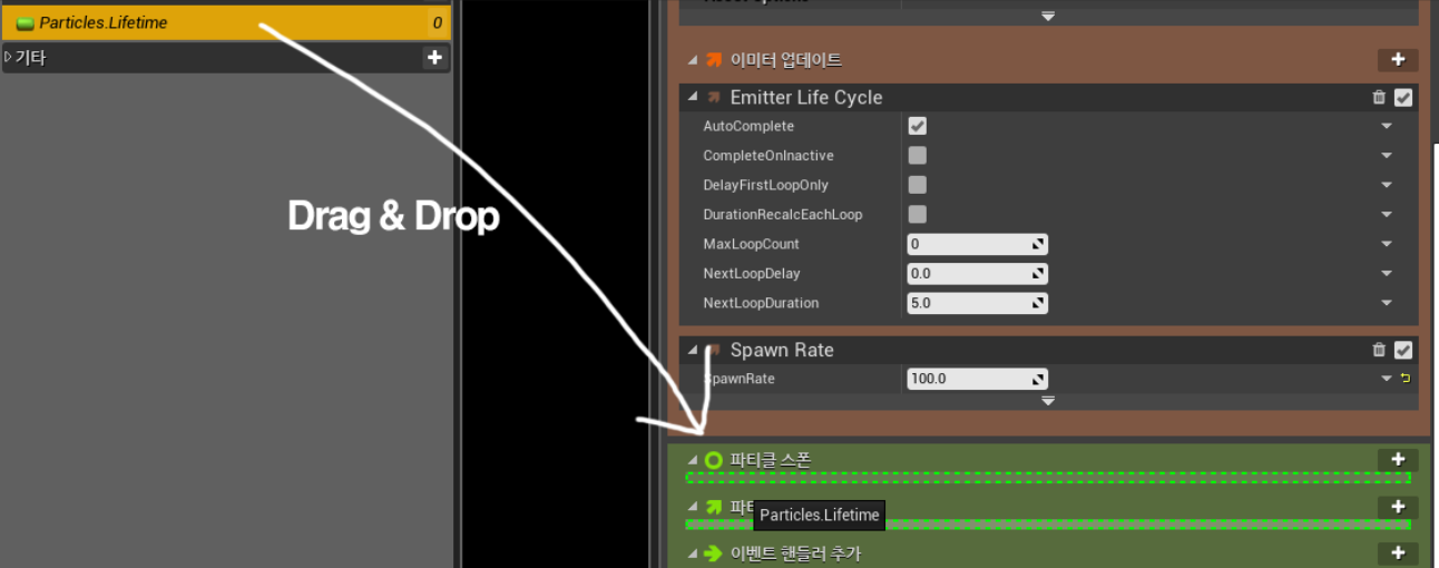 위 사진 처럼 추가한 파라미터를 드래그앤드롭으로 파티클 스폰 섹션에 배치합니다.