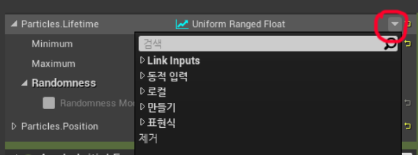 파라미터 패널에서 파티클의 "+"을 눌러 "Particle.Lifetime"을 추가합니다.