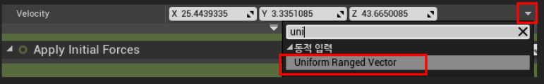 Velocity값 설정 부분의 하단 화살표를 누르고 "Uniform Ranged Vector"를 설정하면 Min~Max사이의 렌덤 값을 Velocity값에 넣을 수 있습니다.
