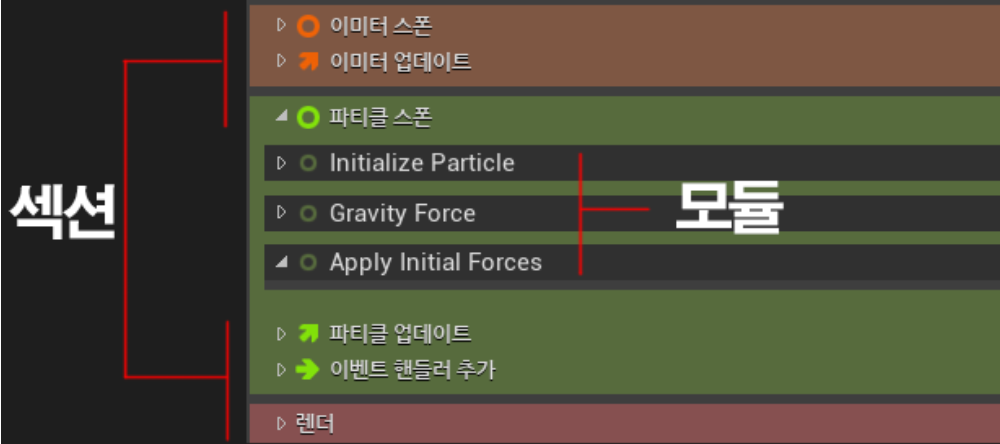 각 섹션은 특정 동작(Spawn, Update)을 실행하며 해당 역할에 맞는 섹션에 모듈을 장착하는 형태로 사용합니다.