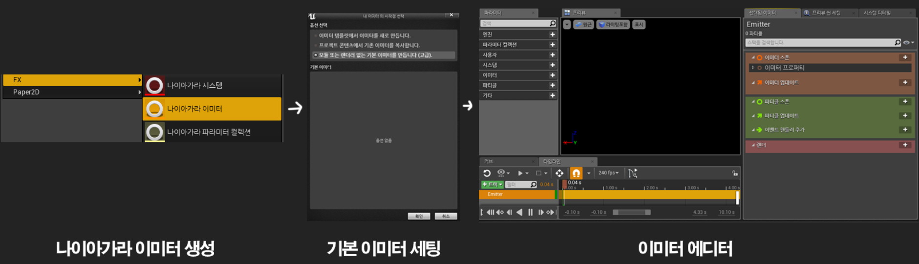 크게 이미터, 파티클, 렌더로 구분되며 해당 섹션에 맞는 모듈을 설정할 수 있습니다.