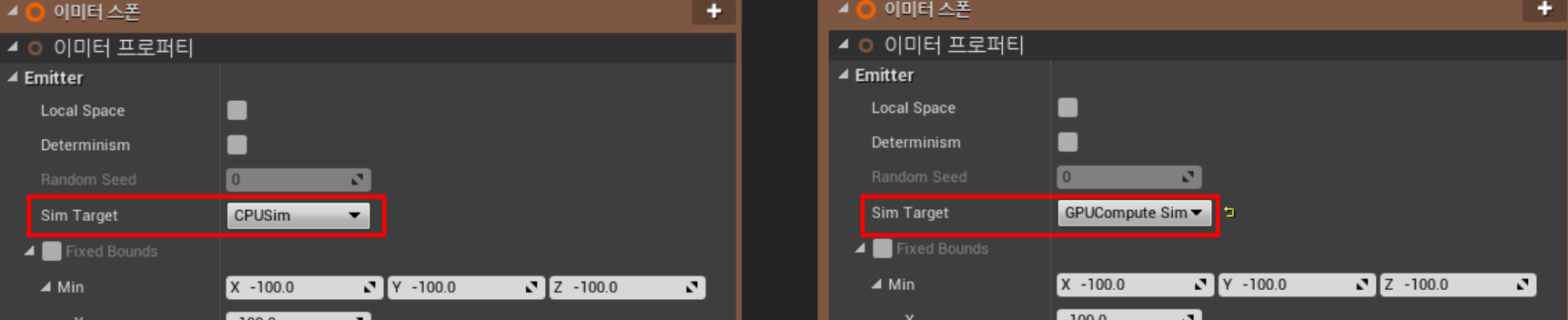 먼저 "이미터 스폰"섹션의 "이미터 프로퍼티" 모듈에서 Sim Target 설정을 통해 CPU/GPU 시뮬레이션 모드를 변경할 수 있습니다.