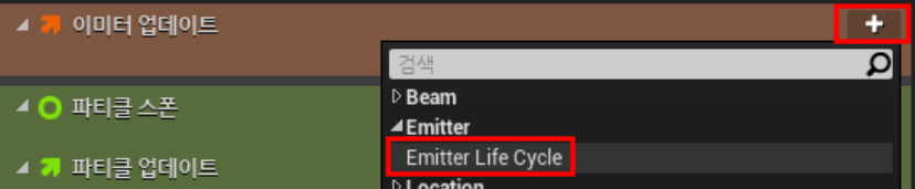 다음 "이미터 업데이트" 섹션에서 "+"버튼을 눌러 Emitter Life Cycle 모듈을 추가합니다.