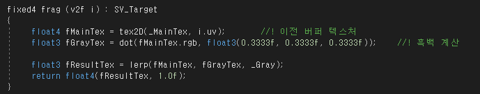 float3 fGrayTex = dot(fMainTex.rgb, float3(0.3333f, 0.3333f, 0.3333f)); //! 흑백 계산
