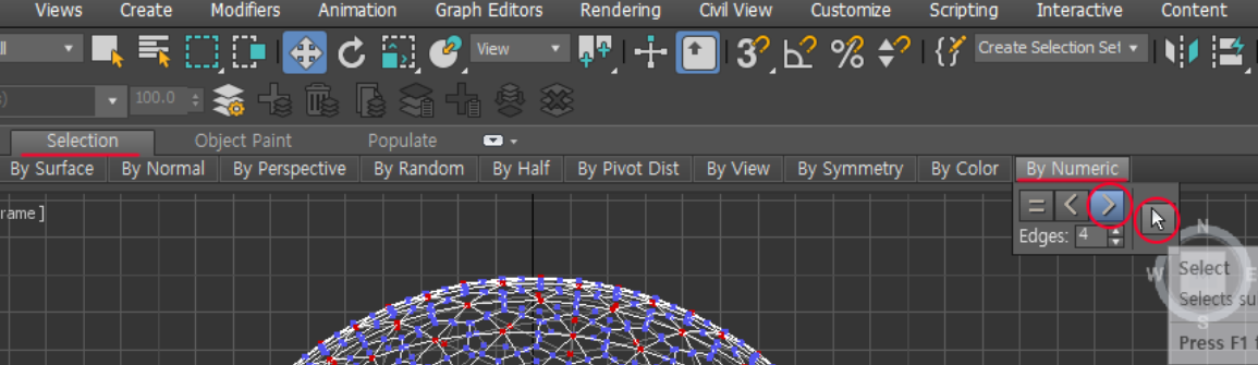 Selection 탭 -> By Numeric 에서 4 Edges, ">"을 선택한 후 커서(Select) 버튼을 눌러줍니다.
