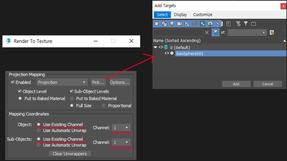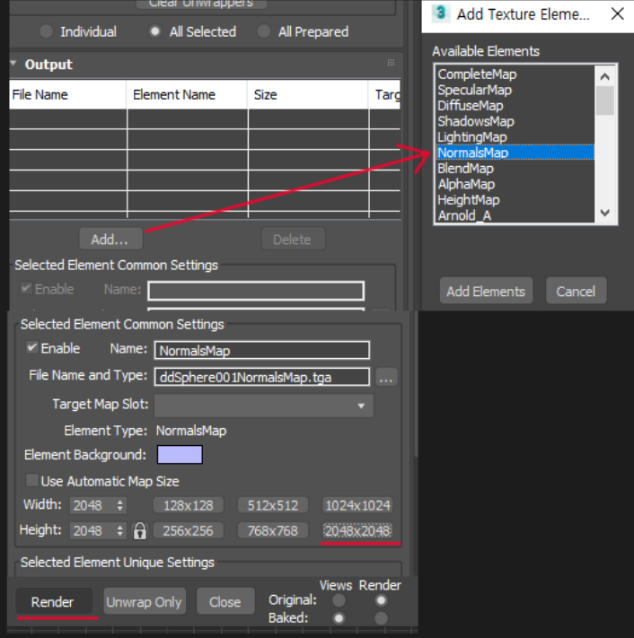 다음 Render To Texture(단축키 0)에서 위와 같이 세팅합니다.