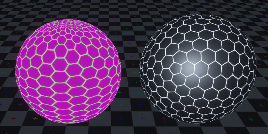 좌측이 일반 헥사곤 텍스처를 입힌 결과물이고, 우측이 이번 튜토리얼의 결과물입니다.