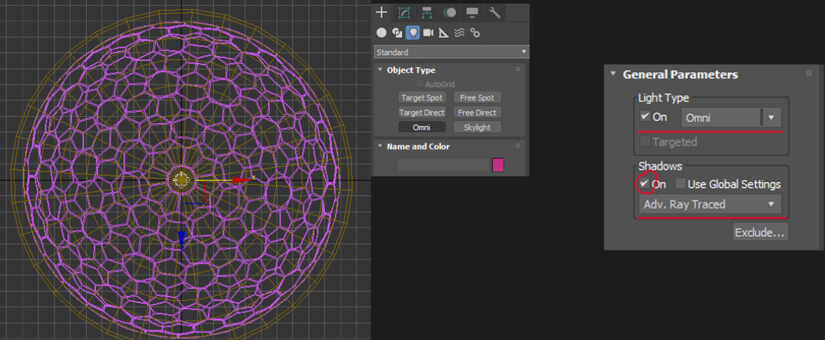 Omni 라이트를 정중앙에 설치 후 옵션을 위 사진 우측 처럼 세팅합니다.
