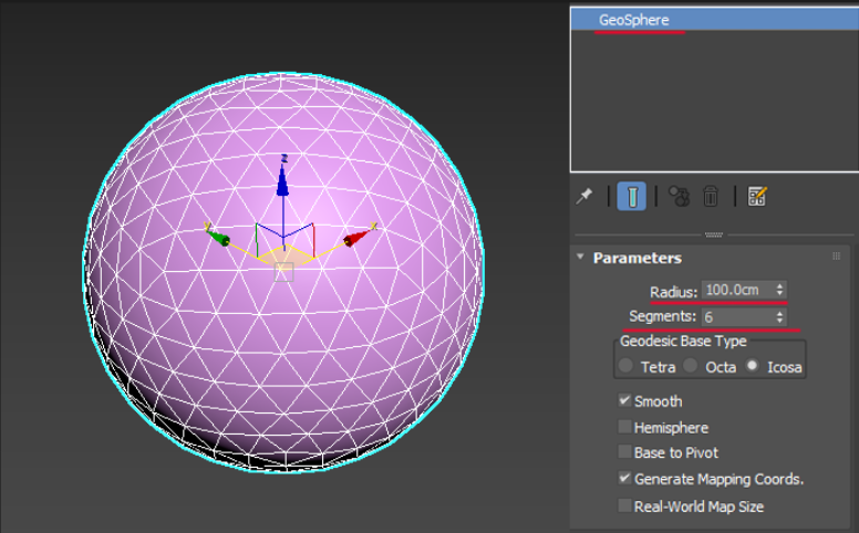GeoSphere모델 생성후, 파라미터는 위와 같이 설정합니다.
