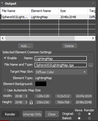 다음 Render To Texture에서 Output에 LightingMap으로 세팅하고 렌더링하면 끝입니다.
