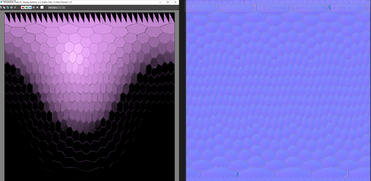 맥스상에서 렌더링 결과물은 좌측과 같이 노멀맵이 아닌 형태로 나오지만, 실제 파일을 열어보면 정상적으로 노멀맵이 생성된것을 확인 할 수 있습니다.