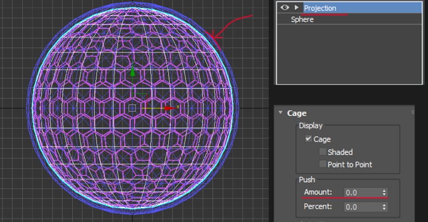 Sphere 모델에 Projection Modifier을 추가하고 설정에서 Amount를 조절하여 뷰포트에 보이는 파란 프로젝션 구체를 이전에 만든 모델보다 좀더 크게 설정합니다.