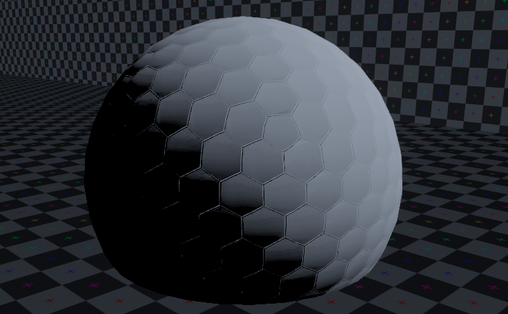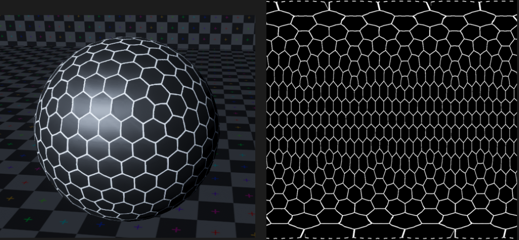 가장 쉬운방법으로 위 헥사곤 텍스처를 구체에다가 입히면 이상한 결과물이 나옵니다.