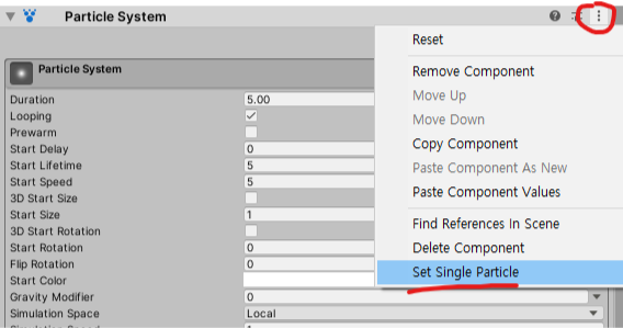 [MenuItem("CONTEXT/ParticleSystem/Set Single Particle")]
